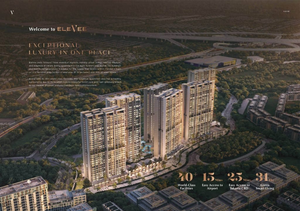 Elevee dikembangkan dengan konsep Area Terbuka Hijau yg luas dan refreshing serta memilik akses lansung ke Forest park seluas 4 hektar, sehingga mesikupun anda tinggal di pusat CBD Alam Sutera anda tetap akan merasa tinggal di lingkungan yg asri dan menyegarkan. Selain itu Elevee juga dilengkapi dengan lebih dari 40 Fasilitas Bintang 5 yang tidak akan dapatkan di tempat lain.