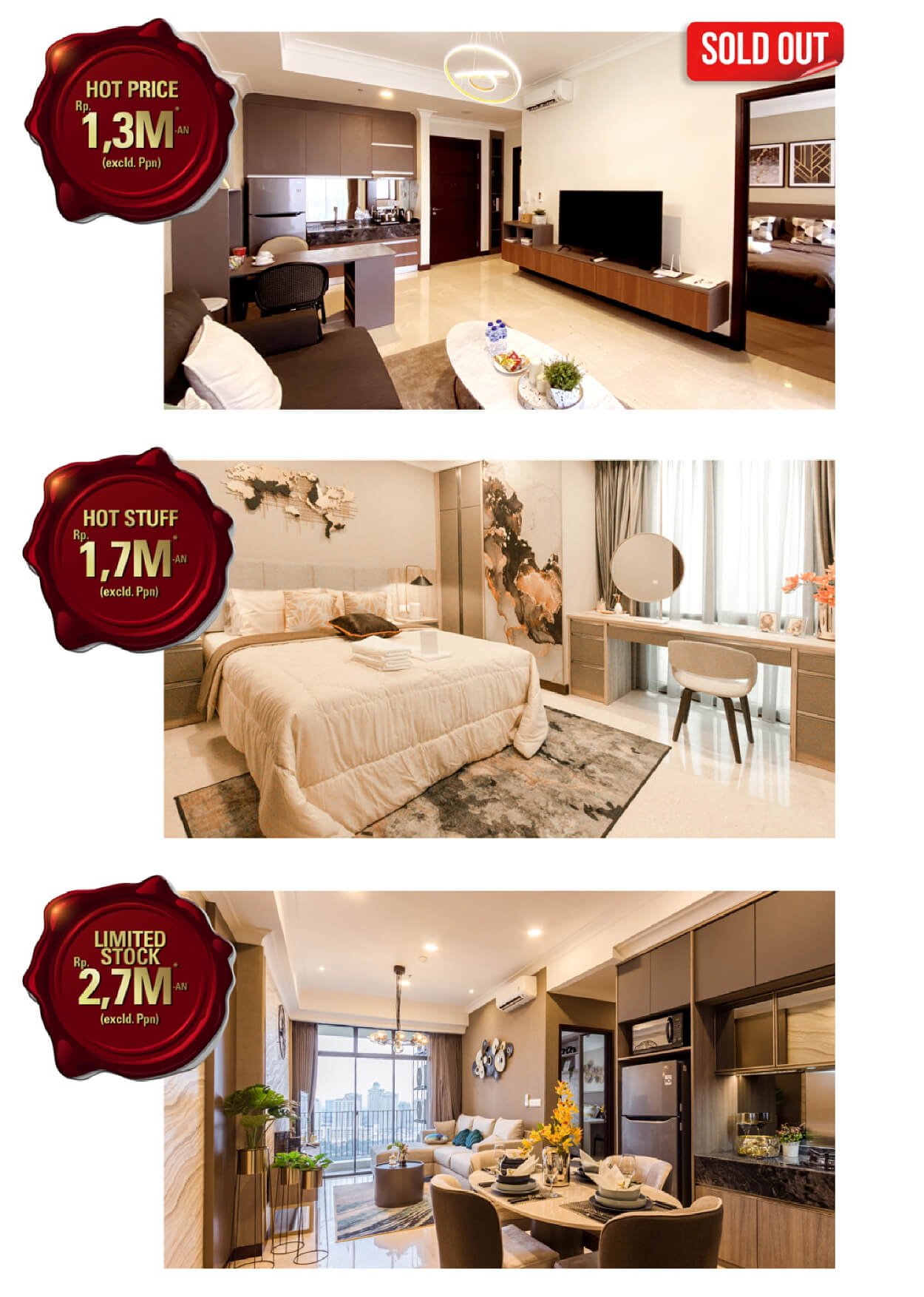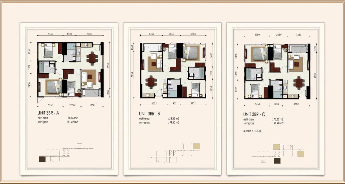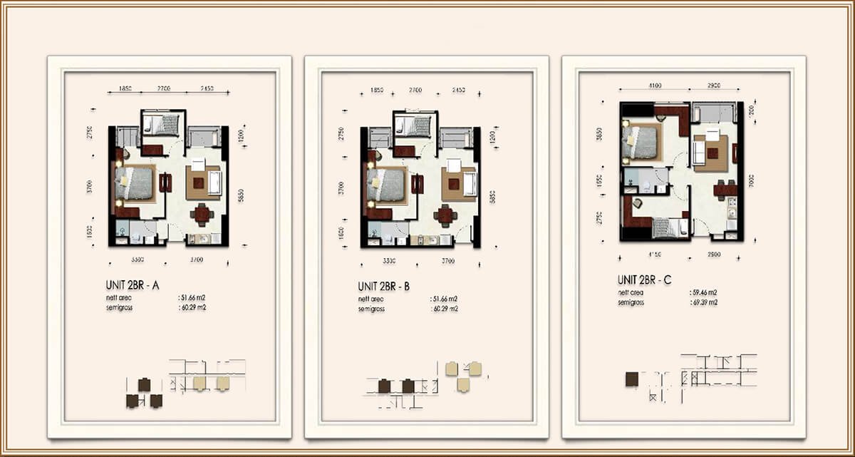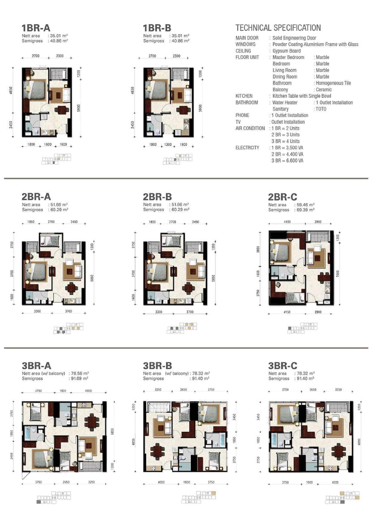 - Bedroom: 1 BR, 2 BR & 3 BR