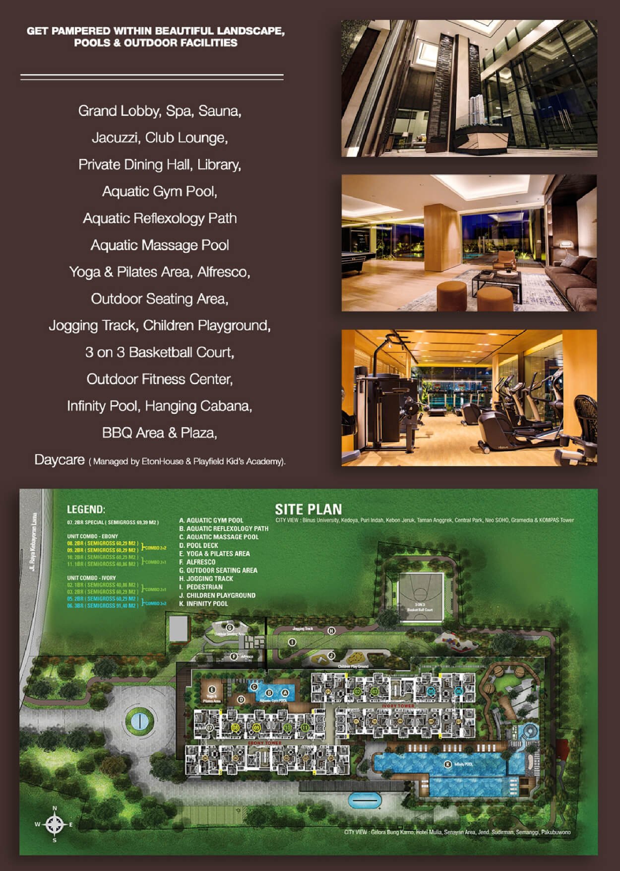 - Facility: Club Lounge, Spa, Sauna & Jacuzzi, Gym & Fitness Centre, Private Dinning Hall, Aquatic Gym Pool, Aquatic Reflexology Path, Aquatic Massage Pool, Yoga & Pilates Area, Exercise Pool & Leisure Pools, 3 on 3 Basket Ball Court, Children Playground, Alfresco Dining, Outdoor Seating Area, Jogging Track, Hanging Cabana, Infinity Pool, Outdoor Fitness Center, Library, BBQ Area
