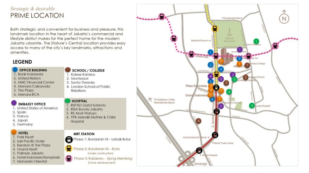 Lokasi The Stature Residences sangat strategis di jantung Kota Jakarta, tepatnya berada di Jl. Kebon Sirih, Menteng, Jakarta Pusat. Lokasi ini memiliki akses yang sangat mudah menuju berbagai fasilitas publik mulai dari sekolah, perkantoran, pusat perbelanjaan, hotel, transportasi umum dan lainnya.