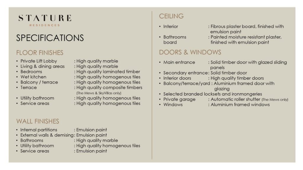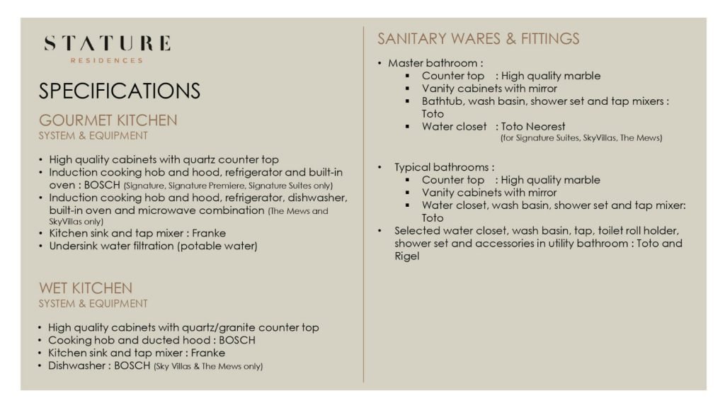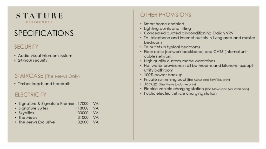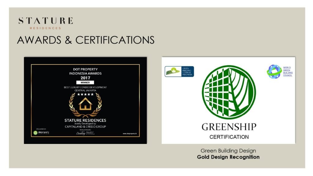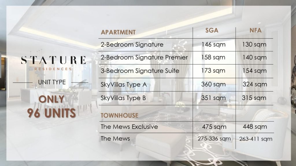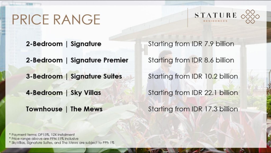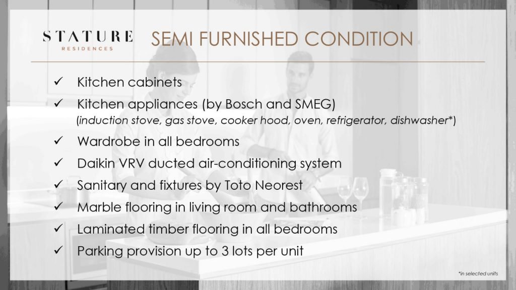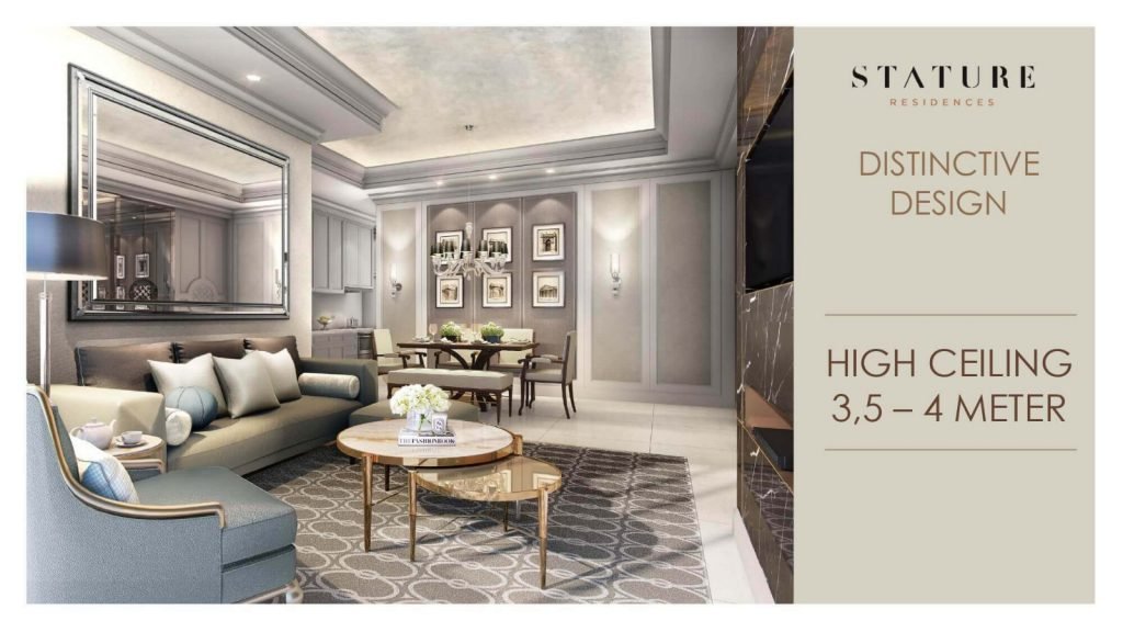 Selain lokasi, The Stature Residences Jakarta menawarkan kemewahan pada unitnya dengan memberikan kondisi semi-furnished dengan spesifikasi tinggi, high ceiling, private lift, 33 fasilitas dan masih banyak lainnya.
